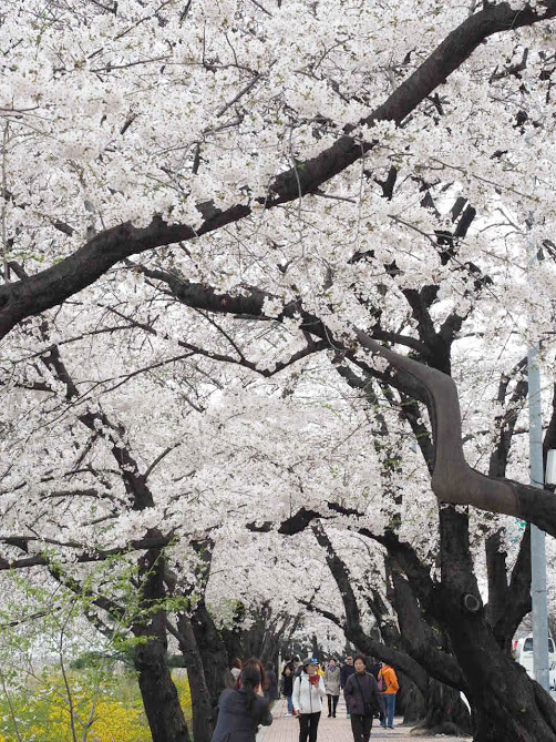 逛完市集,一般網友都會返車站搭巴士經十里櫻花路到雙磎寺落車,然後漫步反程到車站回釜山。但我地喺花開留宿,唔使急,過番車站果邊,漫步十里櫻花路。落車時已見滿地花瓣,心諗,又話花開嘅花期稍遲嘅?出發前仲驚未開添!